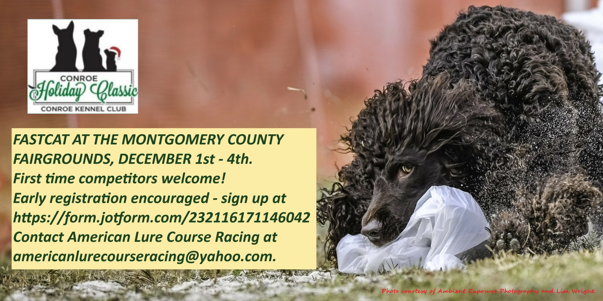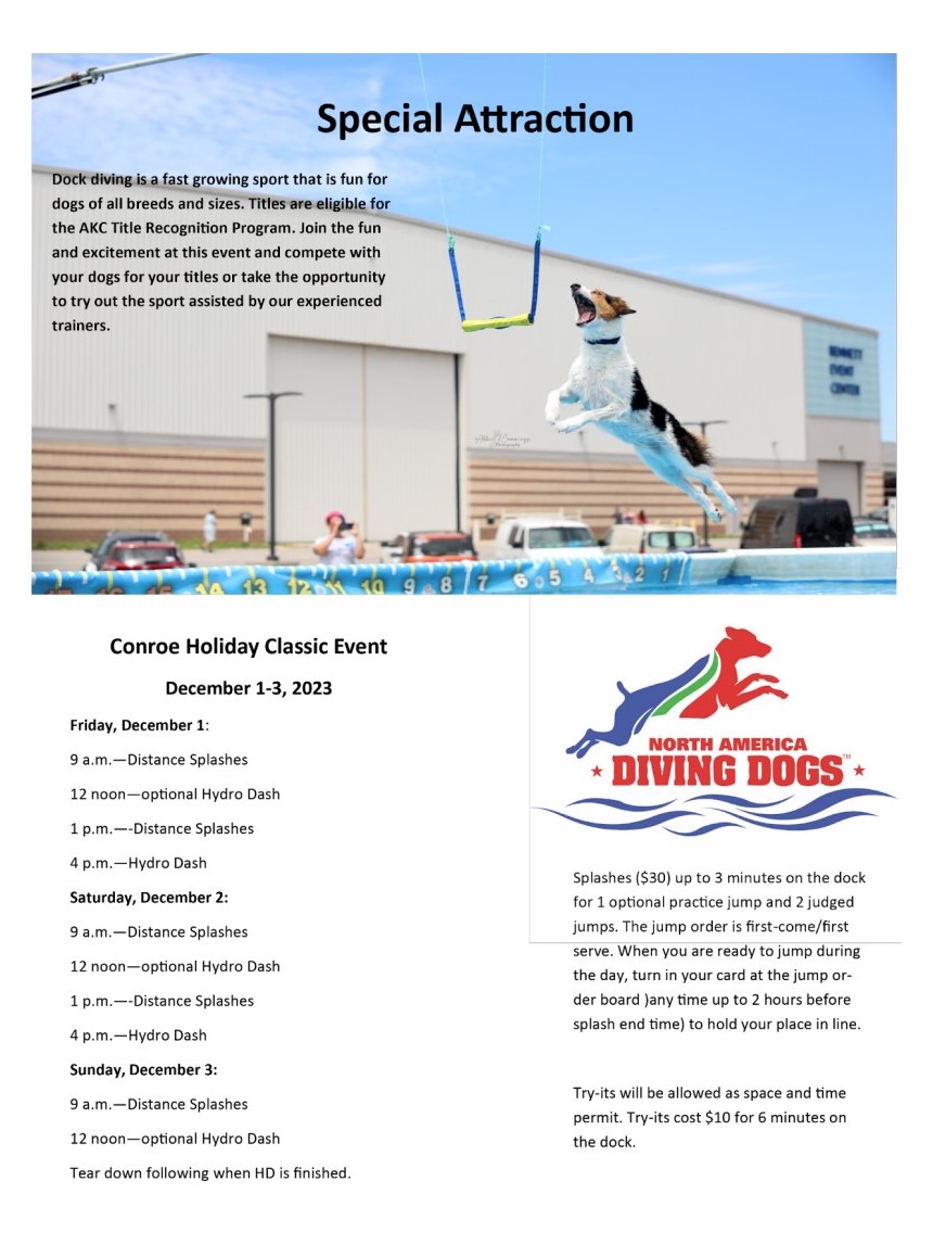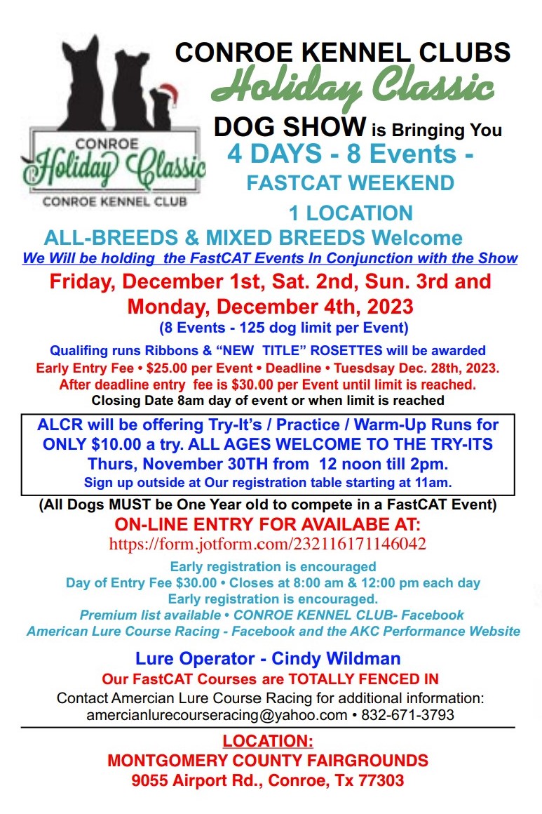 While you’re thawing your turkey tonight and planning your Black Friday shopping, don’t forget to plan for the Conroe Holiday Classic next weekend! The Conroe Kennel Club hosts the annual AKC event at The Montgomery Fairgrounds, going on from December 1st through the 4th. First time competitors are welcome to try out in the FAST CAT competition and, new this year, Dock Diving! The entry form for FAST CAT registration can be found at https://form.jotform.com/232116171146042 . (Find more info at www.akc.org under events, at www.conroekennelclub.com , and the full Premium at https://www.onofrio.com/plist/xcnr1pl.pdf )